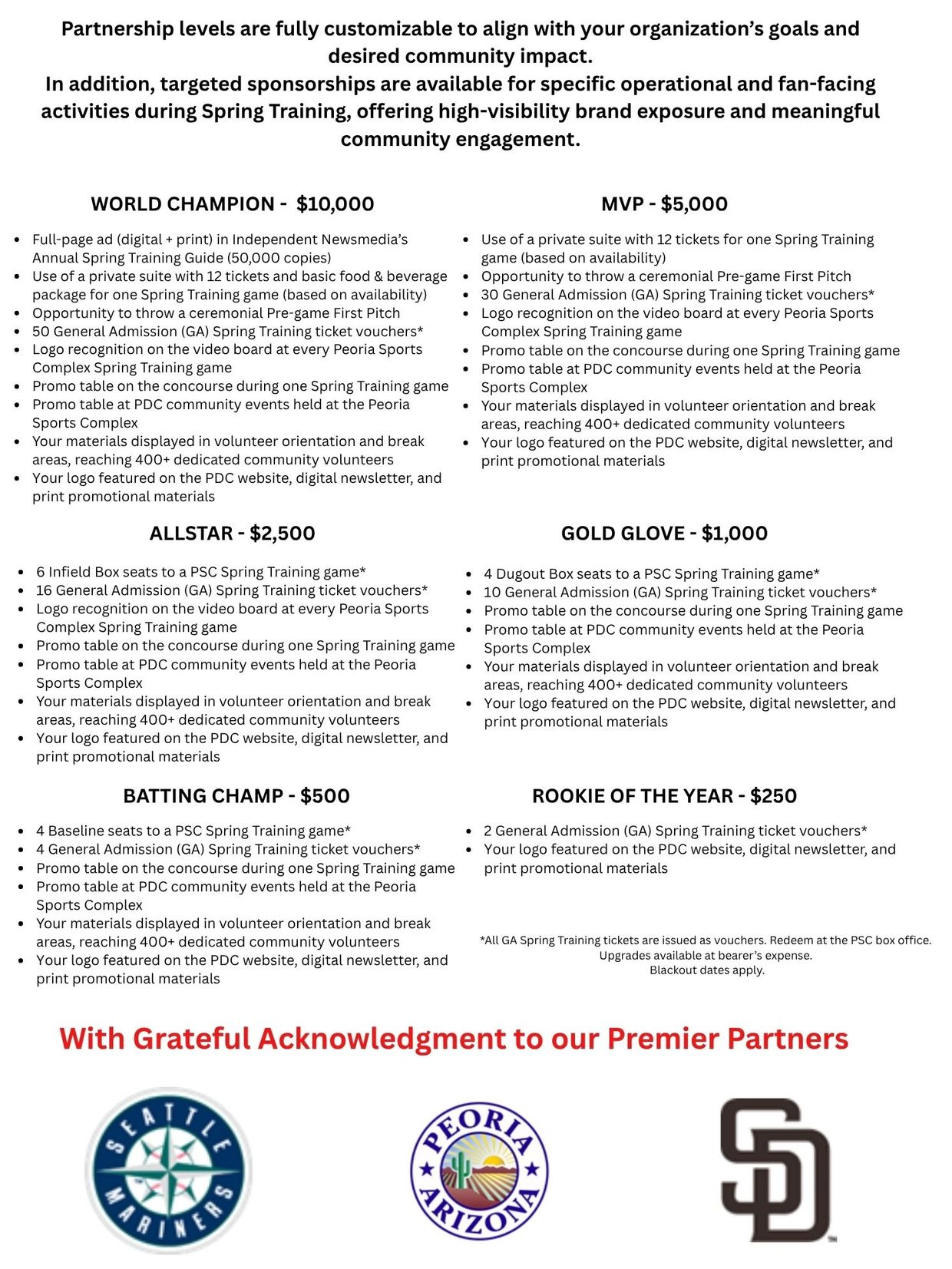 Our powerful partnership with the City of Peoria, the Seattle Mariners and the San Diego Padres, along with our other valued partners, and dedicated sponsors, allows the Peoria Diamond Club to give grants and support programs that are created to enhance the success of our most precious resource,